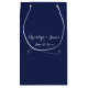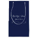 Elegant small navy blue wedding gift bags with changeable text and decorative graphics