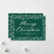Elegant holiday card with "Merry Christmas" displayed in a bold white calligraphy script with a white snowflake and pine branch border on a green background. Personalize the front of the non-photo holiday card by adding your name and the year. The back of the modern holiday card features your custom message with a beautiful snowflake pattern.