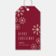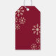 An elegant holiday gift tag by stacey Meacham featuring scattered metallic falling snowflakes on a jewel tone background.