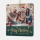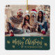Modern Elegant Script Snowflake Green and Gold Photo Merry Christmas Script Holiday Ceramic Ornament. Features one) photo template „Merry Christmas” text. The „Merry Christmas” greeting text is written in a beautiful hand lettered whimsical font script and around gold snowflakes on green colour background. This Ceramic Ornament Cute gift for your family and friends in Christmas Holiday season.