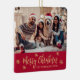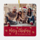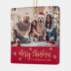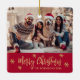 Modern Elegant Script Snowflake Red and Gold Photo Merry Christmas Script Holiday Ceramic Ornament. Features one) photo template „Merry Christmas” text. The „Merry Christmas” greeting text is written in a beautiful hand lettered whimsical font script and around gold snowflakes on red colour background. This Ceramic Ornament Cute gift for your family and friends in Christmas Holiday season.