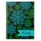 An elegant winter snowflake pattern in rich shades of green and blue over a black background personalised with your name, monogram or other text by replacing the sample text in the design template. To change fonts, use the "customise it" button.