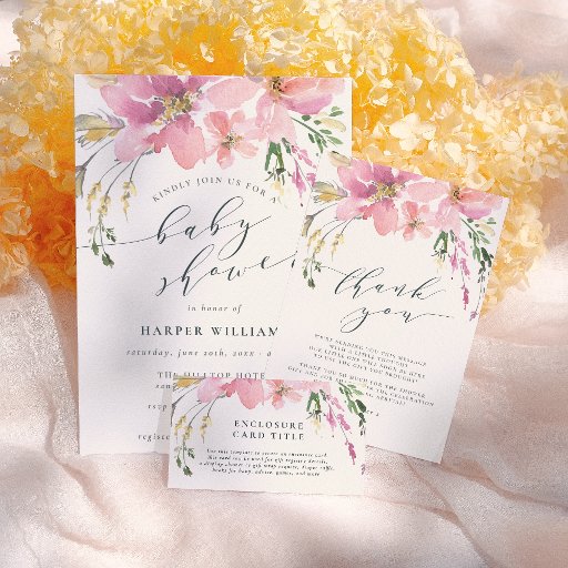 This floral baby shower invitation features "baby shower" in an elegant handwritten style calligraphy and elegant typography framed by a bouquet of watercolor flowers in shades of blush pink and purple with lush botanical leaves. Your shower details appear in a modern typography. This invite is perfect for spring and summer baby showers. The back of this postcard invitation has been left blank so that you can write a custom message and add an address.