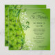 Fancy St. Patrick's Day invitations with lots of shamrocks and white and green scroll work on a green gradient background.