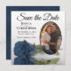 These beautiful save the date cards are the perfect way to let your friends and family know about your upcoming wedding. They feature an elegant modern floral design with a single long stemmed dusty steel blue rose reflecting in a pool of water with waves and ripples with your photo in an oval shaped frame on a classic white background. The caption reads Save the Date with space for your names, the date, and location. The back is a marbled blue grey colour.