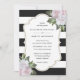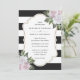 Invite your guests to your elegant black and white wedding party with these pink floral wedding invitations featuring pink flowers and greenery on a black and white striped background.