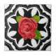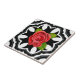 Stylish modern ceramic tile design featuring a seamless mosaic pattern made of geometric shapes in black and white and decorated with red roses.