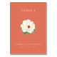 This is a minimalist style image featuring an elegant table number card for "Table 2" set against a warm coral background. At the centre, there's a beautifully illustrated white peony flower with green leaves, adding a touch of natural charm and sophistication. The names "Isabella & Patrick" are elegantly written below the flower, along with their special date, Saturday, June 6, 2026. It exudes a sense of refined elegance and joyous celebration, perfect for wedding or event decor to guide guests with grace.