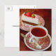 This elegant postcard captures a cozy tea moment with a delicate slice of strawberry cake and a warm cup of tea served on vintage-style china. The rich colors and classic composition create a refined, timeless atmosphere, perfect for those who appreciate simple pleasures and beautiful details.