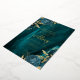 This elegant wedding invitation features teal blue floral bouquets set off with gold faux foil greenery in two corners, on a background image of teal watercolor agate. The customisable text combines real gold foil serif, italic and handwriting fonts. The reverse side features a matching teal and gold floral and agate design.