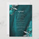 This elegant wedding menu features teal blue floral bouquets set off with gold faux foil greenery in two corners, on a background image of teal watercolor agate. The customisable text combines silver grey serif and handwriting fonts. The reverse side features a matching teal and silver floral and agate design.