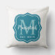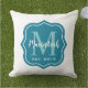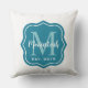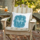 An elegant outdoor pillow featuring a bold family monogram with oversized initial, script family name, and established year inside a decorative teal bracket frame on a white background. All text is fully customisable to personalise with your family details. Coordinates beautifully with colourful striped outdoor pillows for a cohesive patio setup. A classic personalised gift for housewarmings or family milestones.