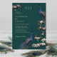 This Elegant Teal Floral Peacock Wedding Foil Invitation features hand-drawn blue and teal peacocks perched on Magnolia branches in full bloom in black ink with real gold foil. Elegant dark teal background. Personalise with your wedding details by clicking on "Personalise this template" on the product page. All text is editable.