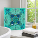 An artistic tile for bathroom or kitchen featuring a fantasy geometric design in teal and mint green colours.