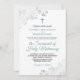 This beautiful wedding invitation is perfect for a modern Catholic ceremony. It features a beautiful design with elegant teal or turquoise script lettering and ornate silver grey faux foil curls and swirls in the corners on a classic white background. Includes a cross or crucifix, and wording inviting your guests to attend a nuptial mass uniting the couple in the sacrament of holy matrimony. This invite is the perfect combination of formal tradition and modern style, making it a wonderful way to invite your friends and family to share in your joy on your special day.