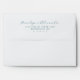 This wedding envelope design features a minimalist layout with ample white space, creating a clean and modern aesthetic. The soft teal colour palette adds a fresh and calming touch against the plain white background. Elegant script typography highlights the names, while a simple sans-serif font provides clear address details, ensuring both style and functionality. Perfect for formal occasions, this design conveys understated elegance and sophistication, making it ideal for weddings or other significant celebrations.