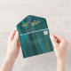 Chic teal satin looking tri-fold wedding invitation, with lovely graphics of a gold tone flourish with a colourful peacock decoration. The custom text ready to personalise for your wedding day. Matching products available.
