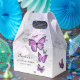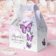 Create your own elegant purple butterfly favour boxes for any big day using a simple DIY template easily personalised with a name or monogram, celebration, a short message of love and thanks, and other custom text. The original art by Raphaela Wilson depicts a beautiful arch of silver and purple watercolor butterflies that have a unique floral pattern on their wings. These whimsical garden beauties flutter throughout this pretty fairytale themed design, and have a light drop shadow beneath to give them a cool 3D look. The background on these cute template favour boxes might be a soft silver grey stone texture with an etched rose and sparkle glitter, but you can change the hue to any colour of the rainbow. The magical, once upon a time theme complements beautifully with butterfly weddings, a lavender quinceañera (XV), light purple sweet 16 birthday party, Cinderella princess baby shower for a girl, lilac bridal shower, among other special moments. By customising the girly design further, additional creative options in champagne yellow gold can be uncovered, and feel free to switch out the chic script calligraphy and modern fonts to a typography style that best suits you. Give guests who've helped make your big day come to life a show of gratitude with personalised thank you favour boxes. Enjoy! Category: personalised box for candy favours with butterflies; 15 years old quinceanera favour boxes; purple monarch butterfly wedding favour boxes for her / mis quince anos. Purple butterfly party theme colours: amethyst, dusty light purple, lilac, lavender, ultra blue violet pastel, light grey, dark grey, faux metallic silver, black and white.