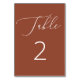 This elegant table number card features a burnt sienna background, with delicate white script and clean typography for a warm, refined look. The warm terracotta brick colour adds a cosy, autumn feel to your decor, while soft rust clay tone makes it perfect for fall weddings, boho themes, or rustic events. Minimalist yet bold, this design helps guests find their seats in style while complementing seasonal colour palettes and warm toned table settings.