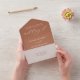 Warm terracotta and white all in one wedding invitation featuring expressive calligraphy script over an earthy, sun-baked background. "Wedding Of" sweeps across the top in flowing hand lettering, blending modern romance with organic warmth. A detachable RSVP postcard with meal options tears off for easy guest response, and the back can be addressed individually to each guest — no envelope required. A botanical leaf sprig adorns the return address flap. All text and colours are editable.