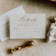 Classic wedding response card featuring a serene off white coloured background and elegant terracotta calligraphy.