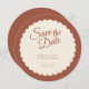 Elegant yet modern and with a touch of retro glam, this Wedding Save the Date card features a scalloped shaped circle, shades of terracotta and beige and elegant script calligraphy. Customise this design with your own wedding information.