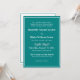 The elegance of bygone years with a modern look distinguishes this wedding invitation of white wording against a beautiful deep teal. It is simple to substitute all your information for our placeholders. Contrasting modern fonts begin with an invitation from the bride's parents, the names of the couple, and the names of the groom's parents -- all in white against a turquoise / teal / dark aqua background. A silver flourish separates the names from the ceremony details - in the same fonts and colours. The bottom line can be deleted if you prefer a separate invitation for your reception. A band of white frames the edges of the card. Colours are reversed on the back, with a white background and teal frame. Here is a great space to include directions to your venue or other information you believe your guests would appreciate. Yes, this is unconventional, and we suggest deep teal or black fonts, but if you prefer - get creative and go wild with colour. Wedding invitations have evolved from "one right way" tradition to "have it your way" freedom. Staying with the nuptial times, this teal and white wedding invite offers both traditional touches and modern updates. Continue to edit and update until it reaches perfection for your event.