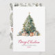 Modern Botanical Foliage Elegant Calligraphy Red Script Christmas Tree Non Photo Christmas Cards. This festive simple minimalist Christmas Holiday cards features a watercolor christmas tree with decoration gold balls, presents and a „Merry Christmas” greeting text which is written in a nice hand lettered font type in red. On the backing watercolor winter botanical foliage greenery, berries, eucalyptus leaves, pine needles and branches. This festive Custom Photo Christmas Cards are a great way to remind loved ones that you're thinking of them this Winter Holiday Season.