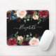 Modern Elegant Watercolor Mixed Floral Mouse Pad includes burgundy roses, pink roses, blue flowers, red flowers and beautiful botanical greenery. Your name in stylish script. Black background or choose your colour.