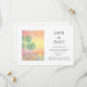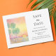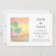 Sunset Beach Wedding Save the Date announcement card with a typography and Tropical Palm trees design. With customisable lettering, you can add your names, and wedding information. You can also add your own photo to add a touch of personalisation. Great for planning your destination nuptials.