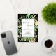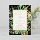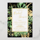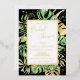 This modern tropical bridal shower invitation features green and gold palm, philodendron, and fern leaves on a black background. An elegant gold foil frame highlights the gold foil text. Gold foil splatters accentuate this exotic botanical design and brings a bit of sophisticated whimsy to the invitation. This island oasis invite is perfect for any elegant outdoor, beach or tropical themed bridal shower.