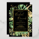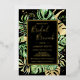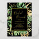 This modern tropical bridal brunch invitation features green and gold palm, philodendron, and fern leaves on a black background. An elegant gold foil frame highlights the gold foil text. Gold foil splatters accentuate this exotic botanical design and brings a bit of sophisticated whimsy to the invitation. This island oasis invite is perfect for any elegant outdoor, beach or tropical themed bridal shower brunch.