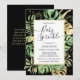 This modern tropical baby sprinkle shower invitation features green and gold palm, philodendron, and fern leaves on a black background. An elegant gold frame highlights the black text. Gold splatters accentuate this exotic botanical design and brings a bit of sophisticated whimsy to the invitation. The back features a sweet poem to let attendees know what a baby sprinkle is. This jungle oasis invite is perfect for any outdoor, beach or tropical themed baby sprinkle.
