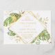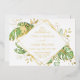 This elegant tropical wedding invitation features green and gold philodendron and fern leaves behind a gold foil geometric frame. Foil splatters around the outer edges accentuate the exotic botanical design. This sophisticated oasis style invite is perfect for any outdoor, island or destination wedding.