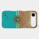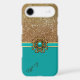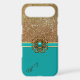 Chic iPhone 6 Plus case done in turquoise, with graphics of a golden glitter looking top half. A golden yellow and turquoise band, across the middle, has graphics of a gold tone and turquoise jewel. Personalise the text, on the bottom of the case, for yourself or as a lovely gift idea.