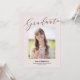 This elegant graduation photo card features calligraphy and a large photo. On the front, "Graduate" is written in pretty calligraphy script across the top, with a large photo below. At the bottom, you can add the graduate's name, school, and graduation year. The typography is black against a soft pink background. The back of the graduation card includes an optional template to add graduation party details.