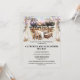 Beautiful pale pink, purple, green and soft white string lights hanging in front of ivory coloured curtain drapes tied back with burnt orange, terracotta floral flowers, appear to sparkle and shine above a square wooden table set with a white table cloth and formal dining cutlery and crockery. Tall topiary bushes appear in the distance amidst a country setting. This very elegant and chic design is ideal for an outdoor Tuscan, French vineyard, Italian winery or garden rehearsal dinner; party or event. Customise the editable black text set against a patel dusky blue background to suit your requirements and delete the string lights if not required.