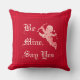 "Be Mine, Say Yes" quote, over a classic, bright, cranberry red background, finished with elegant, decorative text... accompanied by a young, adorned, cupid. Perfect for the romantic, this pillow makes a great way to pop the question! On the back, you'll find a template for memorialising the occasion. Background colour is customisable, as are the text, font styles and colours.