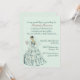 Lovely pale mint green bridal shower invitation, with vintage graphics of a beautiful bride, in a ruffled gown. Text in dark teal and dusty rose and ready to personalise for your wedding event. Pretty invitation the bride will cherish, with her wedding mementos.