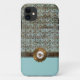 Lovely iPhone 5 case done in a vintage brown and turquoise damask pattern. The bottom of the case is done in a solid muted turquoise, with graphics of a distressed brown floral ribbon between the solid bottom and the damask background. Digital graphics of a gold tone and pearl look bauble decoration, on the ribbon, has a brown old world style font one letter monogram. Personalise the initial for yourself or as a great gift idea.