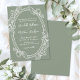Sage Green Filigree Frame Wedding Invitation. Add a touch of timeless elegance to your wedding with this refined and romantic design. The invitation features a soft sage green background on both sides, paired with a delicate white oval filigree frame made up of graceful swirls and flourishes for a classic, airy look.
