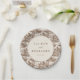This is a vintage style image featuring an elegant wedding invitation design with intricate sepia-toned illustrations of quaint cottages and lush trees in the background. The central circle showcases the names "Lauren and Benjamin" along with their special date, May 23, 2026, all set against a soft, neutral backdrop. It exudes a timeless charm and romantic sophistication, perfect for couples who appreciate classic aesthetics. This design would beautifully complement a rustic or countryside wedding theme.