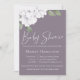 Pretty watercolor freesia floral and foliage arrangement in white, violet and green, baby shower invitation. Personalise text font style, colour, and size. Back of card features violet and white stripe pattern.