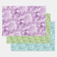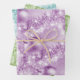 Elegant pastel violet, green and turquoise Christmas gift wrapping paper set with beautiful Christmas ornament pattern, white sparkling lights and shiny tinsel.