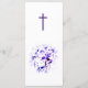Design features the images of delicate violets in top left and lower right corners. Monogram of Bride and Groom are displayed at top followed by Menu heading and menu options. All text is customisable. Reverse features a cross and a larger image of a violet bouquet. Designed to coordinate with the "Elegant Violets Catholic Wedding Suite."
