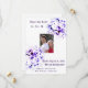 Design features couple's photo at centre surrounded by violet flowers. Above photo reads, "Save the Date!" followed by the date of wedding in numbers. Below photo is the customisable text displaying the same date a written out. A brief message from Bride and Groom appears below. At very bottom city and state of wedding is displayed. All text is in Old English font. Designed to coordinate with the "Elegant Violets Catholic Wedding Suite."