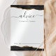 This elegant design features top and bottom borders of black watercolor agate trimmed with gold faux glitter. The word "advice" appears in handwriting calligraphy script with flourishes at the beginning and end. Personalize with the names of the newlyweds in charcoal gray copperplate font. A line at the bottom provides space for guests to sign their advice and wishes for the couple.