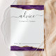 This elegant design features top and bottom borders of purple watercolor agate trimmed with gold faux glitter. The word "advice" appears in handwriting calligraphy script with flourishes at the beginning and end. Personalize with the names of the newlyweds in charcoal gray copperplate font. A line at the bottom provides space for guests to sign their advice and wishes for the couple.