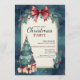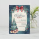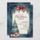 This sophisticated Christmas party invitation showcases a beautiful watercolor background in deep blue tones with a golden frame. The design features evergreen branches, holly, red berries, and a satin ribbon bow at the top, complemented by a decorated Christmas tree and wrapped presents. Perfect for elegant holiday celebrations with a modern artistic touch. Customize with your party details.