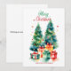 Elegant Watercolor Christmas Tree Holiday card featuring a festive watercolor Christmas tree adorned with glass ornaments and surrounded by wrapped presents. Personalise the card by adding a custom greeting and your family name. The Christmas tree holiday card reverses to your message displayed in dark lettering and a white background.